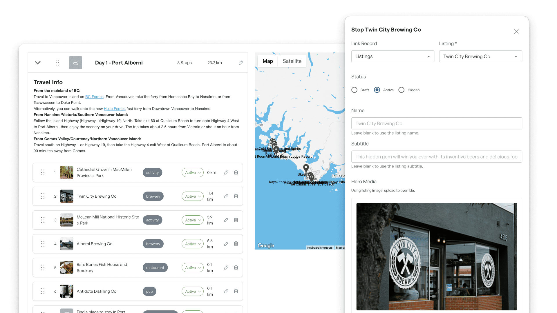 Create legs and populate them with listings, stops, or events. Add or remove any stop, any time.